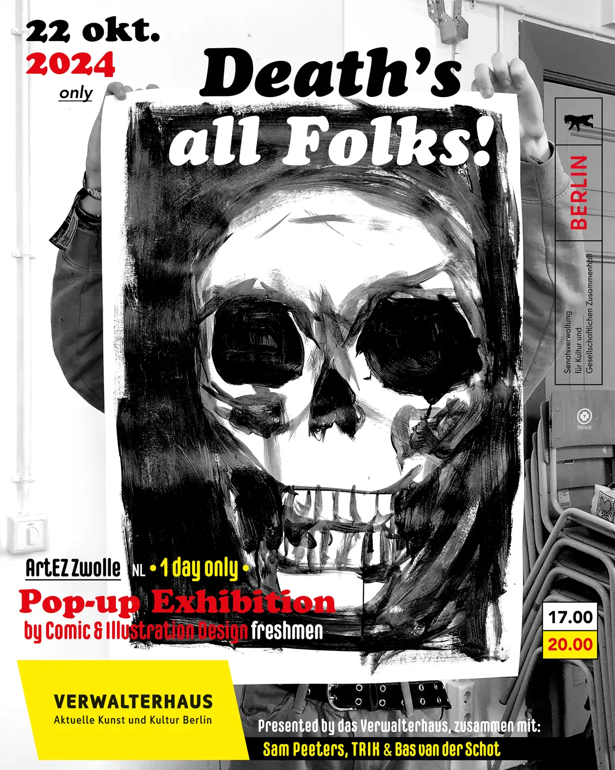 Death's All Folks wird von den Dozenten Sam Peeters und TRIK geleitet, mit dem Gastdozenten Bas van der Schot (Zeichner der Tageszeitung de Volkskrant) in Zusammenarbeit mit den Mentoren von Illustration Design und Niels Beugeling vom Verwalterhaus.