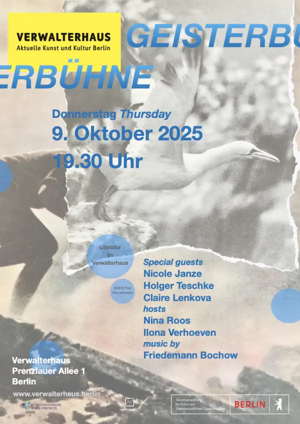 Donnerstag den 9. Oktober ist es zeit für die Geisterbühne! Literatur und Musik im Verwalterhaus. Mit Nicole Janze, Nina Roos, claire Lenkova und Ilona Verhoeven! Musik: Friedemann Bochow. Anfang 19.30. Eintritt frei, Spenden willkommen, happy reading & writing!